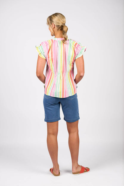 This short-sleeve V-neck top is made from 100% cotton and features a mandarin collar. Frill-trimmed sleeves and tiered back panels with gathered shirring details add soft texture for an effortlessly feminine look.